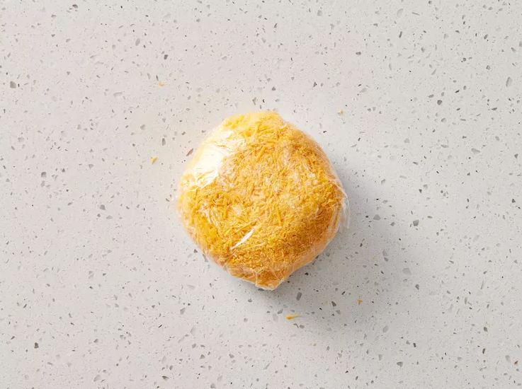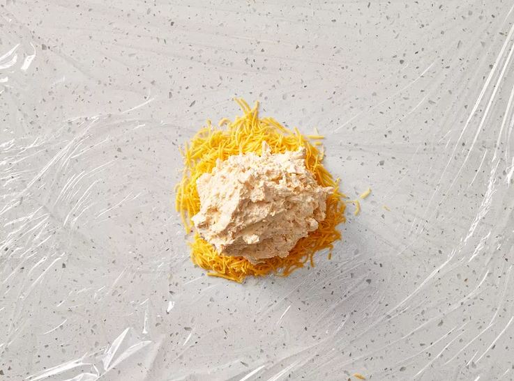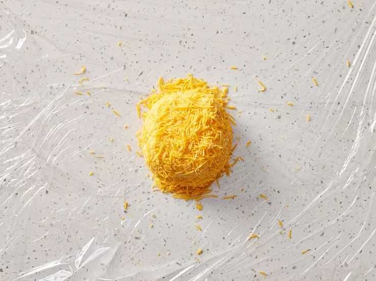 Mbështill. Mblidh letrën plastike përreth masës së djathit, duke e shtrënguar fort në formë topthi. Nëse duhet, përdor edhe një shtresë tjetër plastike për ta bërë më kompakte.
