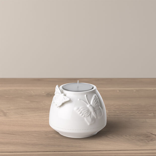 Our timelessly beautiful Colourful Spring collection will delight you all year round. The main actors on the beautifully shaped pieces are delicate snowdrops and colourful butterflies. They give the collection cheerful splashes of colour and brighten up every dull moment. Candlelight often adds the finishing touch on a beautifully laid table. Especially when the light radiates from this delightful tea light holder with a porcelain butterfly on it. Enjoy this spring design every day anew.