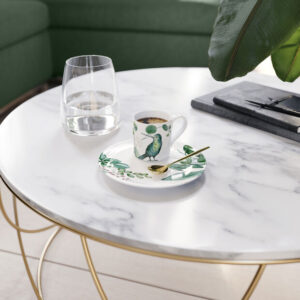 Frymëzuar nga bukuria e Avarua-s, dizajni Avarua i bën homazh udhëtimeve të eksploruesit James Cook dhe tregon historinë e zbulimit të tij me dhunti artistike. Pamja tropikale është e rrumbullakosur me linja të holla floriri që sjellin një efekt fantastik, tredimensional që i jep jetë koleksionit. Me motive botanike dhe ngjyra të buta, filxhani me sheqer Avarua dhe tenxherja e reçelit nga koleksioni Avarua është një ndeshje e përkryer për kompletin tuaj të kafesë dhe do t’ju bëjë të ëndërroni për vende tropikale si Ishujt Kuk. Transportohu në një botë zogjsh të parajsës dhe bimëve ekzotike