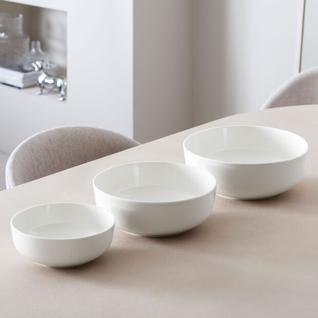 In a world engaged in a quest for both uniqueness and well-being spaces, we are presenting the Afina tableware collection inspired by the lifestyle trend of sophisticated taste. The collection features a unique design concept combining minimalist shapes with delicate, carefully crafted details.The clear shapes come together perfectly with fine details to create a modern coupe shape with a raised rim. Inspired by concentric rays of sunshine, this tableware features a fascinating ring-shaped relief that creates an exquisite tactile experience. The special floating appearance is emphasised by a carefully concealed base area. The medium bowl is very versatile and perfect for serving salads, side dishes and fruits. With its balanced proportions and stylish design, it offers attractive serving options for a wide range of dishes. Discover the perfection of minimalist sophistication with Afina and add an impressive note of glamour to your kitchen and dining areas.