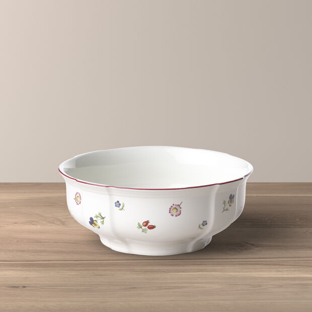 Koleksioni Petite Fleur zbukuron tryezën tuaj me romancë dhe rreze dielli. Dekorimet e shkëlqyera me lule nxjerrin në pah dizajnin e këndshëm. Cilësi nga Villeroy & Boch që nga viti 1748. Tasi i rrumbullakët nga Petite Fleur është një mënyrë simpatike për të shërbyer një sallatë të madhe për drekë, një salcë të shijshme ose një ëmbëlsirë të veçantë. Bërë nga Porcelani Premium me cilësi të lartë. Natyrisht i përshtatshëm për pjatalarëse dhe mikrovalë. Përjetoni koleksionin e enëve të tavolinës me një dekor simpatik me lule nga Villeroy & Boch.