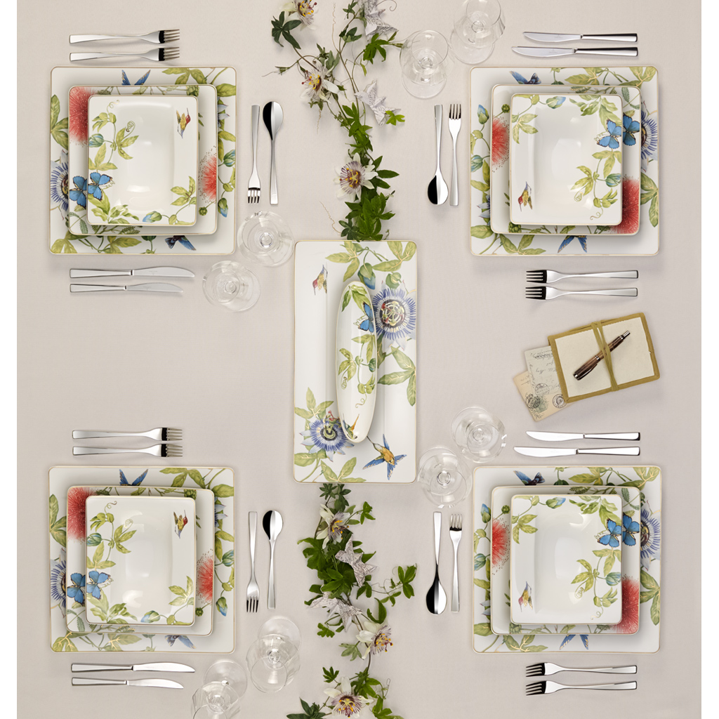 Me dekorimin e Amazonia, Villeroy & Boch përmirëson koleksionin popullor Modern Grace me motive ekzotike, të ndritshme dhe shumëngjyrëshe të pyjeve të shiut – një tërheqje e vërtetë e syve për tryezën. Villeroy & Boch ka qenë sinonim i krijimeve prej porcelani të cilësisë më të lartë që nga viti 1748. Forma katrore dhe dekorimet me ngjyra ekzotike e bëjnë këtë pjatë darke një artikull tërheqës për tryezën tuaj. Shtoni një prekje mahnitëse ngjyrash me enë nga Villeroy & Boch.
