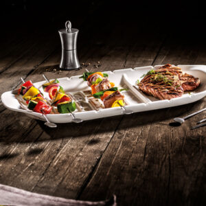 Koleksioni BBQ Passion është i përsosur për mjeshtrit e pasionuar të skarës. Me një dizajn autentik, shkathtësi dhe funksionalitet, enët dhe aksesorët janë idealë për një festë të improvizuar BBQ me familjen dhe miqtë. Villeroy & Boch, që shërben thjesht me stil që nga viti 1748. Pjata shumë e madhe e servirjes është perfekte për mish ose shish kebab direkt nga skara. Kanalet në buzë mbajnë hellet e qebapit. Pa rrëshqitje, yndyra mund të thahet dhe ushqimi i pjekur në skarë mbetet i shijshëm. Bërë nga Porcelani Premium me cilësi të lartë. Natyrisht i përshtatshëm për pjatalarëse. Frymëzohuni nga Villeroy & Boch BBQ Pasioni për adhuruesit e vërtetë të Barbecue.